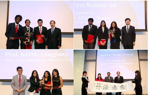 在最终的颁奖典礼上,我校校长黄进高度赞扬了赛队高水平的、令人印象深刻的精彩表现和他们身上体现出来的永不言弃的精神,并对郭红岩老师和同学们的努力,以及志愿者和工作人员的付出表示感谢。随后,张振军博士宣布冠军是第12队Nation Law University,Delhi,黄进为冠军颁奖,张振军为荣获亚军的第18队颁奖,孔庆江为15队的季军颁奖,Fabio Tronchetti为第18队颁发最佳印象奖,杜新丽为第27队颁发最佳团队精神奖,Martha博士为第11队、第18队分别颁发了预赛和决赛的最佳口头表达奖。
