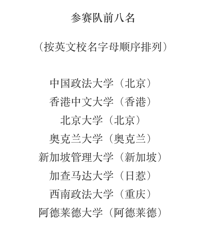 2020级硕士研究生王慧芳和法学院2022级硕士研究生邱悦来作为观察员(Observer)参加了本届比赛。我校代表队向法官们展现了扎实的人道法理论水平、严谨的立论求证和流利的英文表达,在3月8日举行的初赛中先后击败柬埔寨皇家法律经济大学和斯里兰卡公开大学,获得在场法官的一致好评,成功晋级八强。在3月9日举行的四分之一决赛中,两位辩手沉着迎战,灵活应变,但最终惜败卫冕冠军新加坡管理大学,无缘半决赛。澳大利亚阿德莱德大学和新西兰奥克兰大学分别获得冠、亚军,赢得了本届比赛。