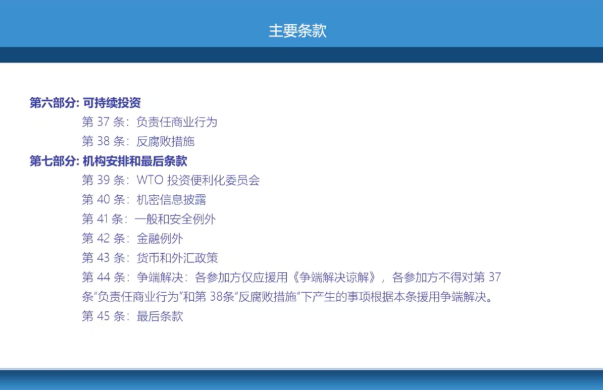 第一份实体协议是《投资便利化协定》。首先,他阐释了《促进发展的投资便利化协定》的重要性,指出该协定能够促进发展中成员和最不发达成员更好地融入全球资本流动。其次,他介绍了投资便利化谈判的重要进展和印度等国反对投资便利化协定的主要理由。最后,他分享了《协定》的目标和重要条款,着重提及了可持续投资中的负责人商业行为和反腐败措施这两个亮点。