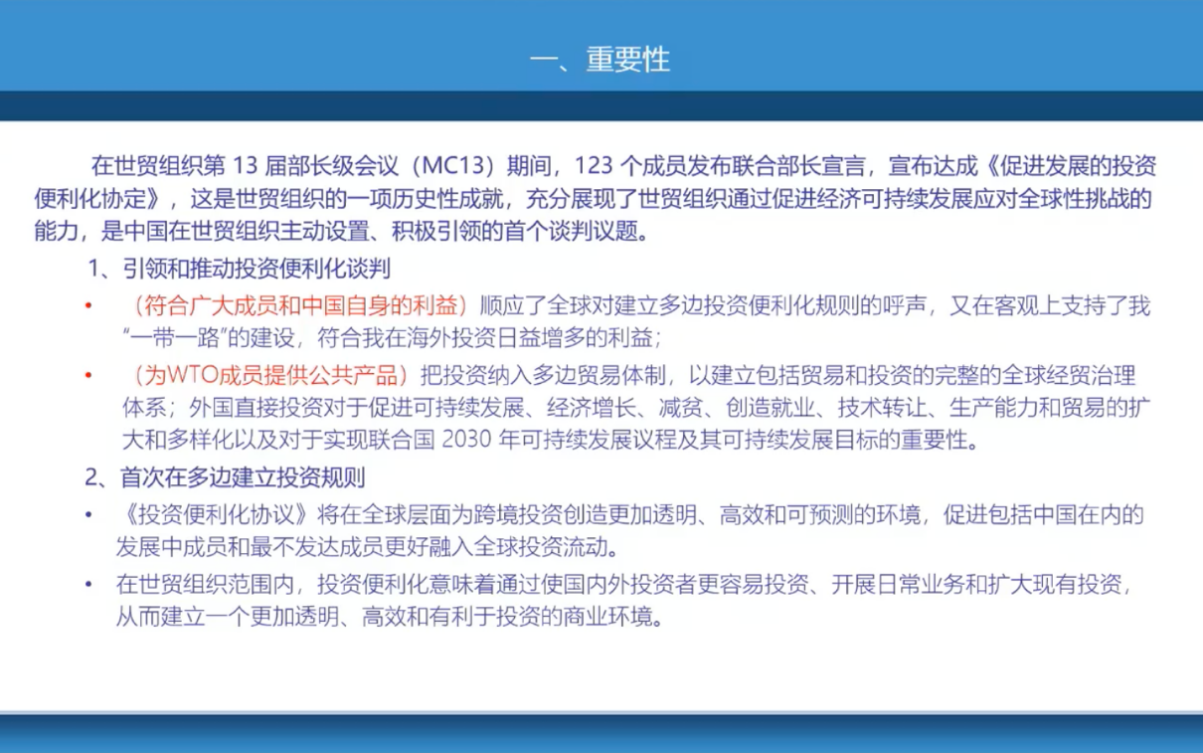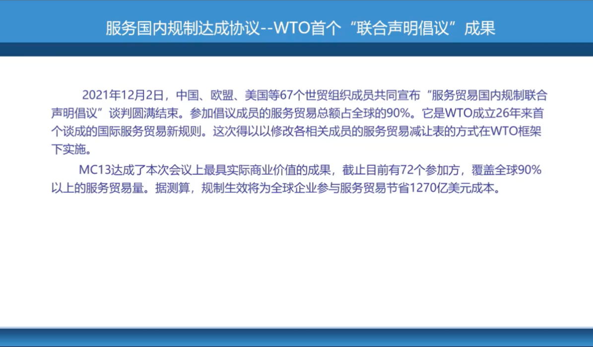 第二份实体协议是服务贸易国内规制联合声明倡议。他介绍了该倡议作为WTO成立以来首个国际服务贸易新规则的重要性,并强调了中国入世时的承诺和行政许可法的法律条款与服务贸易国内规制的相辅相成。