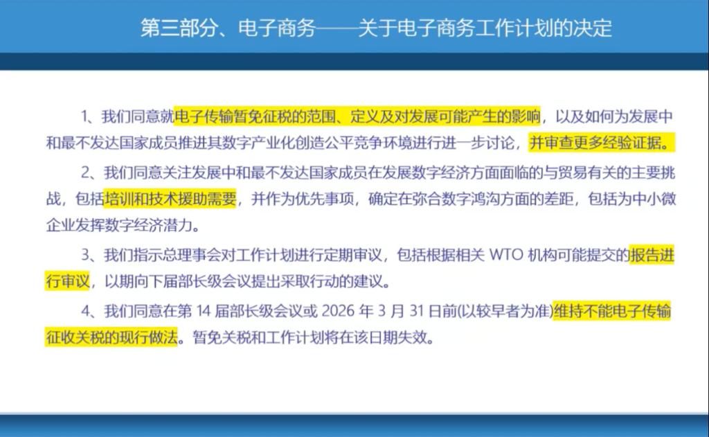 第三份实体协议是关于电子商务工作计划的决定。他主要讨论了电子传输免征关税的问题,并提到了工作计划的重要性和总理事会定期审议的必要性。