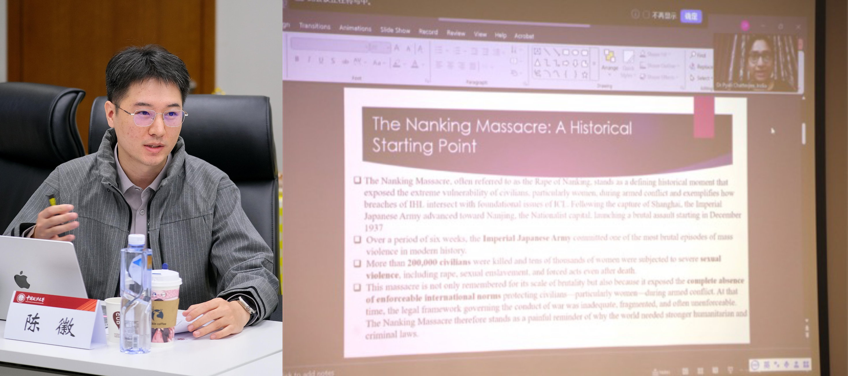 法学院冷新宇副教授首先探讨了“国际人道法的扩张解释和国际刑法的互动”,指出国际人道法的扩张解释趋势与国际刑法的罪刑法定原则之间存在张力,二者的适用边界与平衡路径需结合实践审慎协调;印度国防大学Varun V. M.助理教授随后聚焦“自主武器系统违反国际人道法”议题,深入分析以该类行为追究个人责任时,“间接正犯罪论”的适用可能;北京大学法学院林兆然博士后聚焦海战,既梳理了其历史发展与概念演变,也分析了《纽波特手册》对现代海上冲突规则体系构建的指导意义和实践影响;英国布里斯托大学硕士研究生Nguyen Thi Ngoc Mai则围绕国际刑事司法的实施维度,重新评估了联合国安理会在通过国际刑事司法机制执行国际人道法过程中的实际效能。