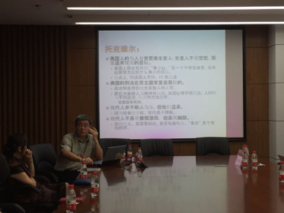 接着,华教授介绍了福山所著的《历史的终结及最后之人》一书。他提出,本书在写法上相较于托克维尔的《论美国民主》理论逻辑性更强,也把托克维尔的思想上升到了普世价值的高度。华教授也提到本书是继马克思之后最重要的一本书,书中认为自由民主因为实现了精神上的平等而成为国家最合理的运作方式,而精神上的平等也是人类社会所追求的最终目标,是历史的终结。此外,华教授还指出,《历史的终结及最后之人》一书中所体现的追求目标与马克思是相对立的,前者追求的为精神上的目标,而后者则是追求物质目标。并且认为中国过去几千年战争死亡的发生都是由于对资源、土地和水源的追求,因而中国人民追随马克思主义是非常正常的事,共产党人亦是抓住了这一思想。而美国在物质上从未有过缺乏,美国早期的移民都是因为渴望追求自由,人们重视精神上的平等,福山在书中的这些论述都掐住了美利坚的脉搏。