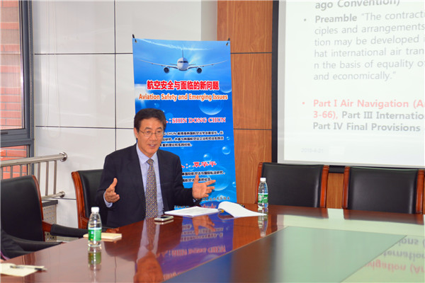 SHIN DONG CHUN教授的演讲分为四部分。首先,SHIN DONG CHUN教授向在场师生简单介绍了航空安全的内涵,并提出了弹性安全管理制度(resilient safety management),即能够应对任何预料之内及预料之外状况的管理制度。然后,SHIN DONG CHUN教授对《国际民用航空公约》(芝加哥公约)及其附件的相关法律条文作了简单的梳理并探讨了国际民用航空组织安全管理制度的相关问题。最后,SHIN DONG CHUN教授详细讲解了当前航空安全面临的几项新问题,即全球飞行追踪系统(global tracking system)仍需改进、战争及冲突地区的飞行风险增加、飞行员资格问题需要重视、民用航空在预防和治理传染病方面发挥何种作用、如何应对极端气象条件对航空安全的影响以及其他新问题。