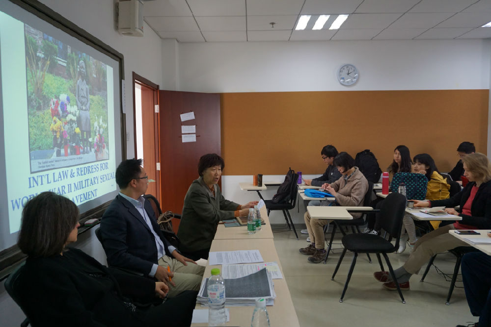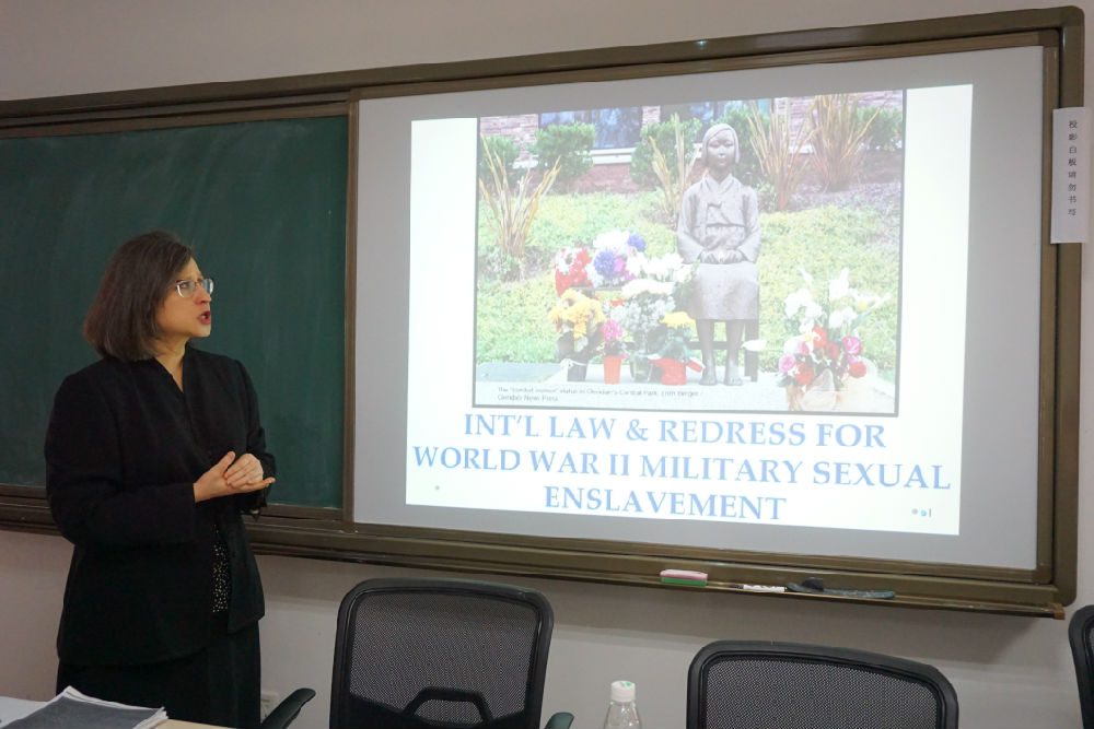 Suzannah Linton教授首先从三个角度阐述了问题,一是第二次世界大战中日本“慰安妇”背景介绍,她阐述了军队和慰安妇关联的起源、Yuki Tanaka教授有关战时性奴根源的观点以及二战时期日本慰安妇在人数及范围上的特点;二是“慰安妇”的求偿运动,如亚洲女性基金会、东京女子审判等;三是为“慰安妇”要求赔偿的全球运动,分别从赔偿、个人责任、国家责任、共同责任、要求赔偿的法律挑战几个方面进行了讲述,其中重点提到了三个障碍:1.在国际法下缺少独立个人提起战争赔偿的资格 2.国家豁免 3.条约中对赔偿权的放弃。