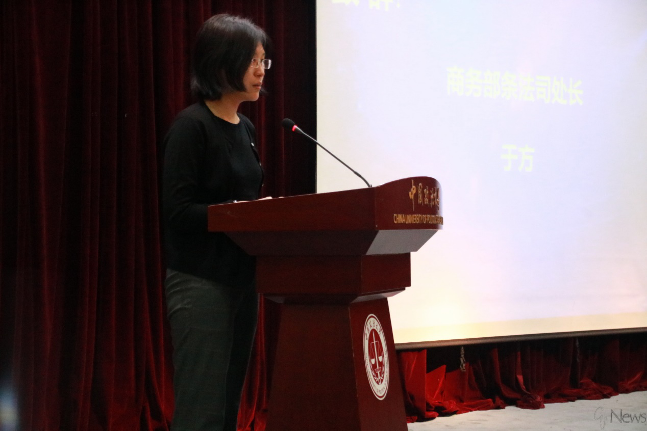 随后致辞的是法官代表、商务部条法司处长于方。在她看来,现在是最好的时代,也是最坏的时代,WTO在发挥积极作用的同时也面临着一定的危机和质疑。她向到场的同学们提出了几点期望。第一是要学好英语,掌握好语言工具,以后才不会举步维艰;第二是要练好法学的基本功。一技在手才能行得天下;第三是要关心时政,要时刻记住法律是活的、不断发展着的,无时无刻不与现实问题联系着;第四是要有爱国情怀,只有将所学所长用在正途,才能为国家、社会做出贡献。
