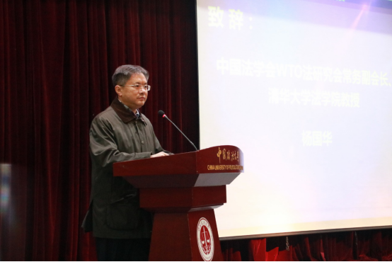 接下来发言的是法官代表、中国法学会WTO法研究会常务副会长、清华大学法学院教授杨国华。他对WT给予了高度评价,指出WTO是人类社会国际法制的一场伟大实践,WTO的案例本身也是很好的教材。他表示,现如今的WTO正面临着严峻危机,但是我们依旧要保有信心,要相信危机只是短暂的、阶段性的现象,要时刻铭记“WTO只会前进不会后退”这个事实。最后,他表示本次大赛及参赛评委、选手对国际法制的坚持不会被忘记,并预祝同学们都能在比赛中取得好成绩。