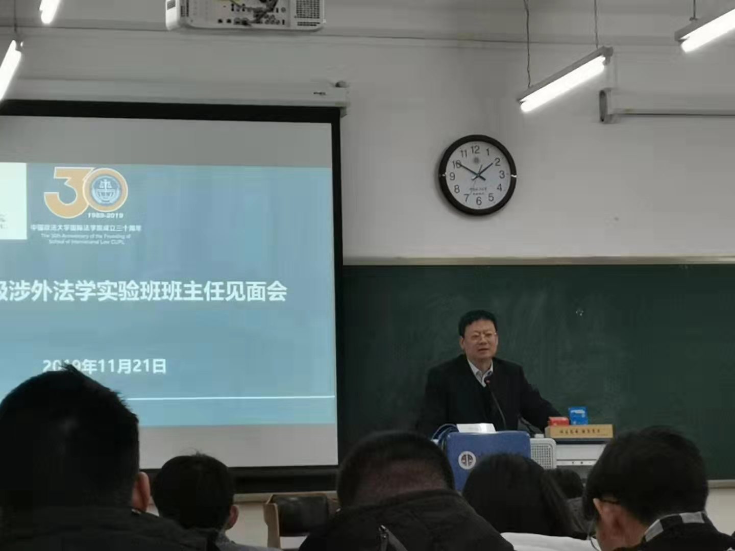 的使命和特色,将如何把涉外法学实验班开展好作为学院工作的重要事项。在涉外人才的培养中学,学院做了大量工作,如改革招生模式、制定培养方案、完善课程设置、搭建出国交流项目等。孔庆江院长对同学们提出要求并表达期许,希望同学们将个人成长与国家需求相结合,建立个人职业规划,成为涉外法律人才。
