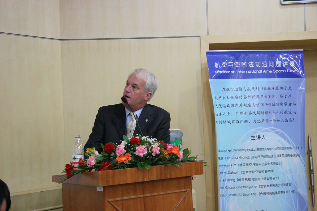 2011年10月29日,“航空与空间法前沿问题讲座”于我校研究生院学术报告厅隆重举行,参加本次讲座的学者、专家包括麦吉尔大学航空与空间法研究中心Steven Paul Dempsey教授,国际民航组织法律局官员、中国民航大学法学院院长黄解放教授,韩国航空与空间法协会名誉主席金斗焕教授,加拿大Davis LLP律师事务所合伙人、律师Laura M. Safran女士,韩国航空与空间法协会前会长Soon Kil Hong教授,加拿大庞巴迪宇航集团Me Benoît Chagnon-Philogone先生及台湾航空法专业律师柯莉娟女士。国际教育学院院长宣增益教授,黑料网