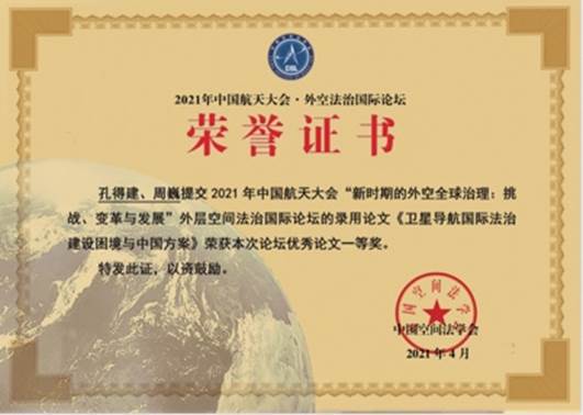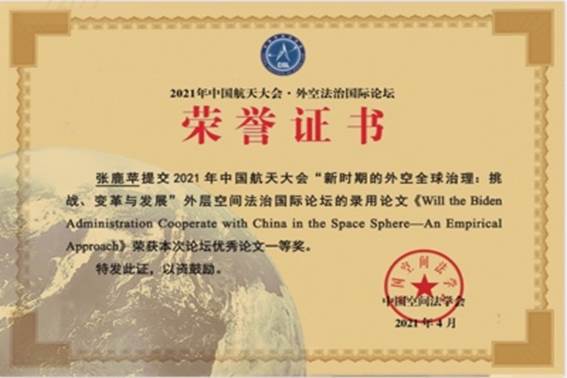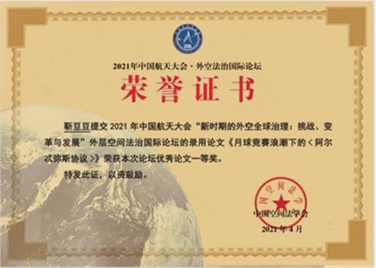 研究生靳豆豆同学参加24日上午举办的“2021中国航天大会·外空法治国际论坛青年分论坛”,并就提交的会议论文进行现场宣讲。孔得建博士、靳豆豆同学所提交的会议论文均获得2021年中国空间法学会年会优秀中文论文一等奖,张鹿苹博士所提交的会议论文获得2021年中国空间法学会年会优秀英文论文一等奖。