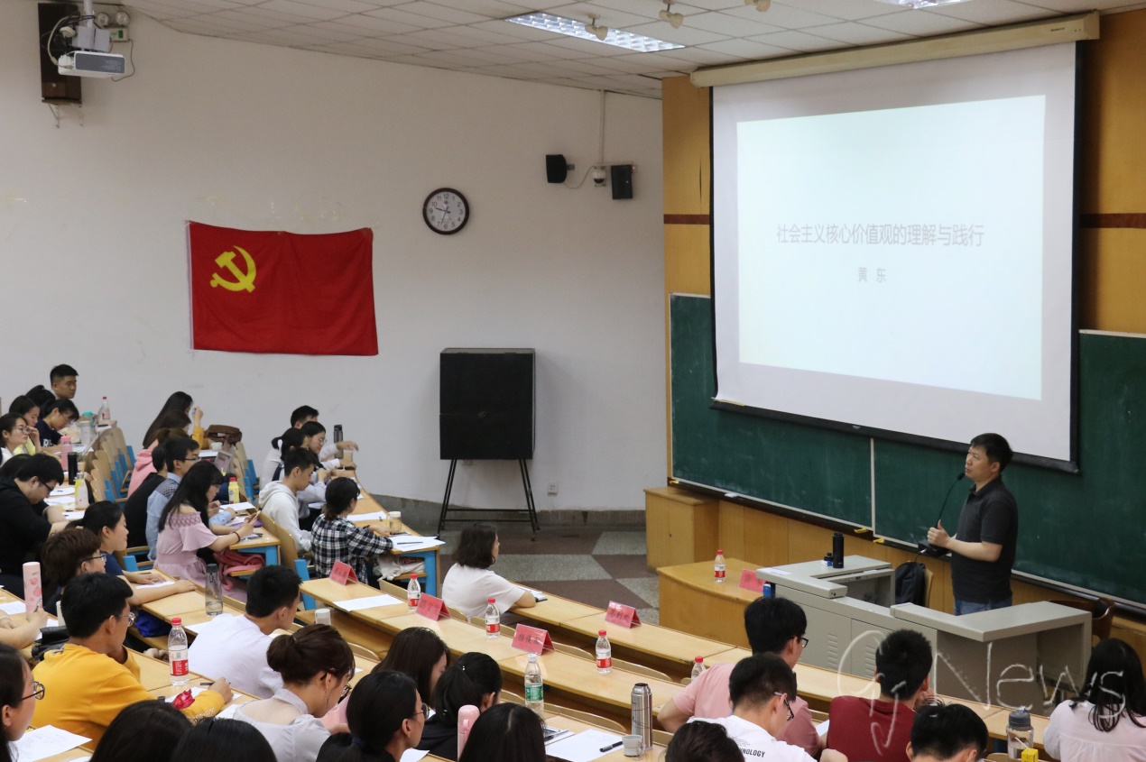 开班仪式结束后,党课正式开始。培训班上午的课程主题是“社会主义核心价值观”。主讲人黄东老师从社会主义核心价值观的内容出发,引导同学们思考核心价值观对个人的导向作用,探讨其对国家软实力的重要影响,深入挖掘核心价值观与中国精神、个人生活的紧密联系,鼓励同学们始终坚持正确价值观的导向作用。