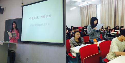 2013级3班和7班团支部一起观看了电影《我的法兰西岁月》,2013级4班团支部组织观看了李林森先进事迹纪录片《忠诚点亮生命》,2013级5班和6班团支部同学利用假期观看了《建党伟业》、《建国大业》、《铁人》等电影,并组织同学撰写影评,党员代表任久岱通过自身学习和支教等经历,与同学们分享了一个当代大学生党员对于当代中国社会的所思所感所想。他呼吁同学们坚持党的领导,努力学习先进,积极投身于社会主义建设中;在日常学习和生活中,要有辨识信息的能力,莫要偏听一家之言;要锤炼自己吃苦擅干的品质,做合格的当代大学生。