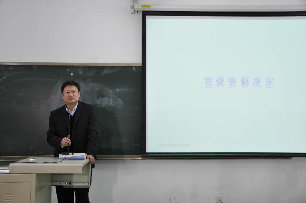 新生运动会表彰决定。随后分别由顾永强老师、杨俊丽老师、刘端端老师和刘瑾老师为获奖的运动队和优秀运动员颁奖。