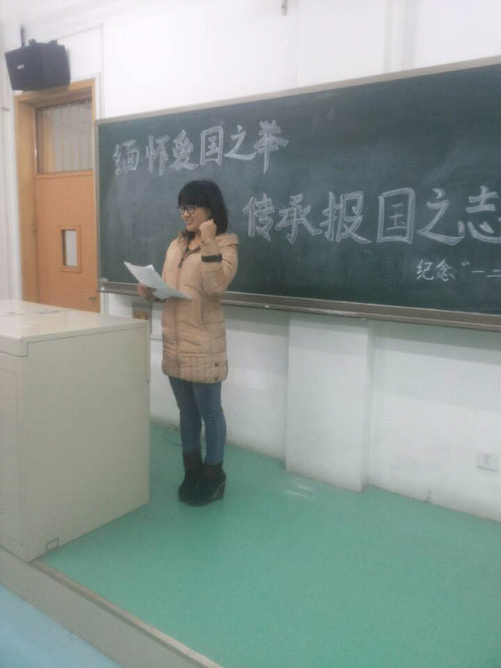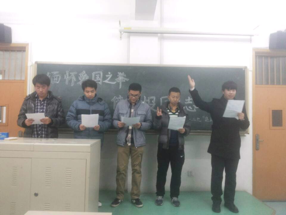 2013级的郭晓阳同学,来自2014级的严育斌同学共同带来了深情的诗歌朗诵。“今天,我们告别了战争/告别了苦难/告别不了的却是/历史上每一个血与火的文字/告别不了的却是/一二九运动中的每一个英雄/是他们,在国家存亡的关头/振臂高呼,促使了反动派的妥协/ 是他们,在民族生死的毫发间/热血横洒,促使了民族的觉醒/今天,我们以圣洁的诗歌/缅怀那段血与泪写成的历史/发扬一二九铸成的那种精神/在告别与缅怀之间承前启后继往开来/请看我今日威武中国!”同学们听后群情激昂,不时地想起热烈的掌声,许多人听后情不自禁地留下了激动地泪水。