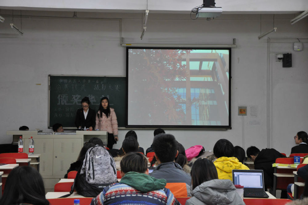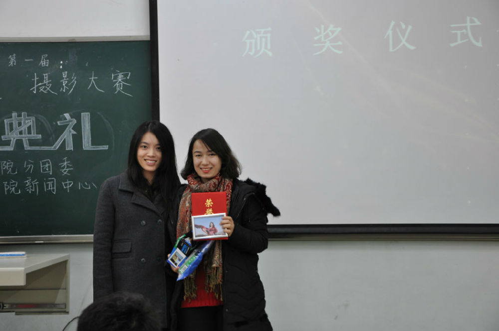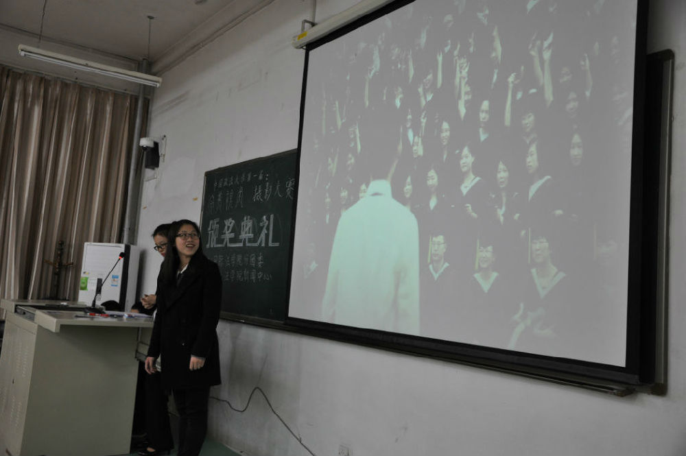 2014年12月4日,摄影大赛迎来了最后的颁奖典礼,晚上七点整,颁奖典礼于端升楼104教室准时举行。获奖选手依次向观众们介绍了自己的作品,在这一环节中,选手们的介绍或幽默风趣,或引人深思,或令人惊叹,而作品的表现更是百花齐放:有《花间花见》的唯美,有《一生一世》的豪迈,有《光影逸夫》的静谧,还有《石板红叶》的浪漫……获奖老师们虽然不能到现场领奖,也纷纷根据自己的作品意境赋诗一首赠与现场同学,获得了同学们的阵阵惊叹和掌声。