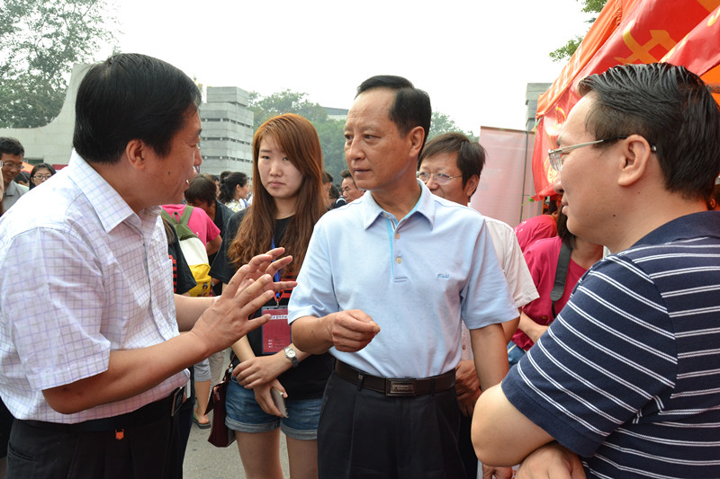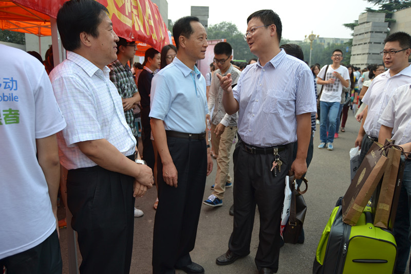 9月6日上午九时许,我校党委书记石亚军、党委副书记兼副校长冯世勇等在相关部门负责人的陪同下来到学院的展台,翻阅了《群言》迎新特刊,并慰问参与迎新工作的志愿者们。石亚军书记强调,要注重新生的见解与感受,从新生的角度出发,进一步完善迎新工作。
