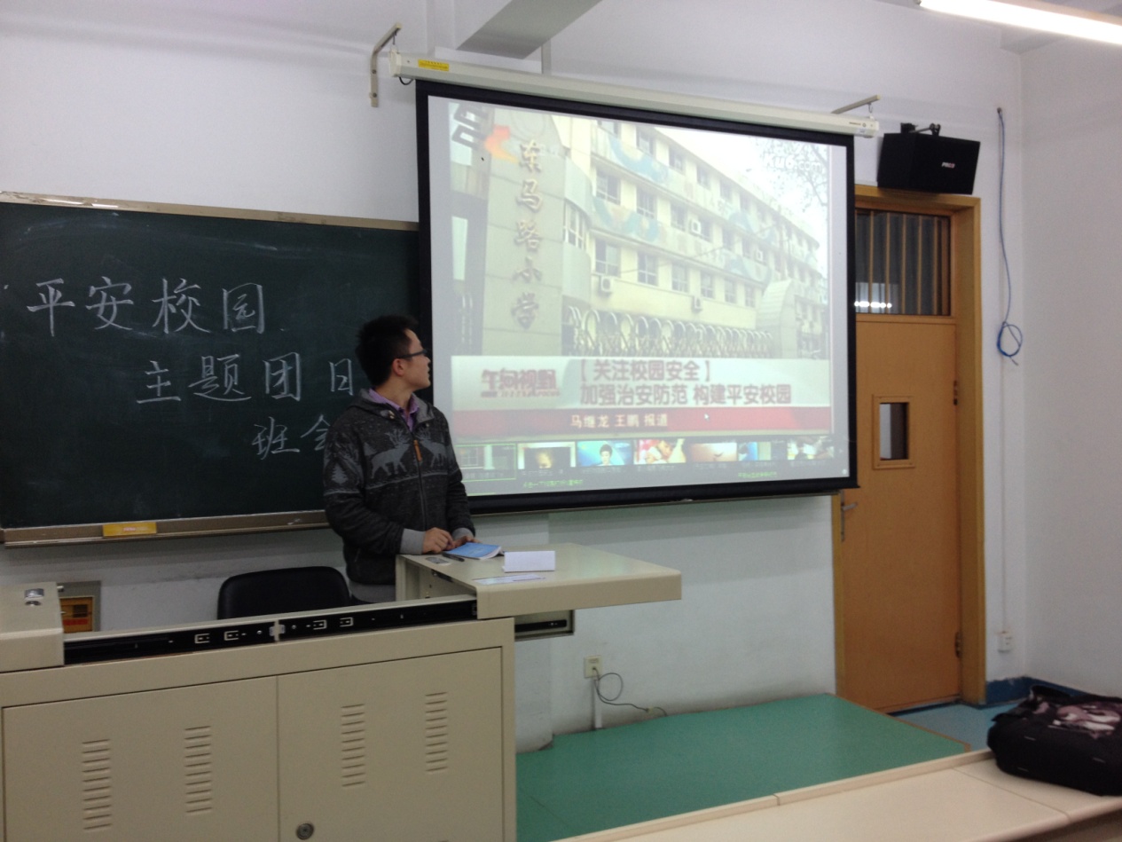 各班团支部结合本班同学的实际情况,紧密围绕“增强安全意识,提高自我保护能力”这一主题,采取了丰富多彩的活动形式。有的采用问卷调查的形式来了解同学们在安全常识上的盲点;有的采用分组讨论的方式,在轻松的讨论中使同学们不仅对身边的安全现象有了更多的关注,也对出现问题后的基本应对方法有了更全面的了解;有的班则采用了生动幽默的单口相声形式,通过简单易懂的话语向同学宣传了大学生安全知识手册的内容;有的班级通过幻灯片的形式向同学们普及安全常识;还有的班级开展安全常识小测验,并对优秀的同学进行奖励,提高了同学们的参与热情。有些班级积极地将安全知识落到实践中,或是走入校园,或是深入寝室,使同学们在深化了对安全知识的理解,取得了良好的效果。