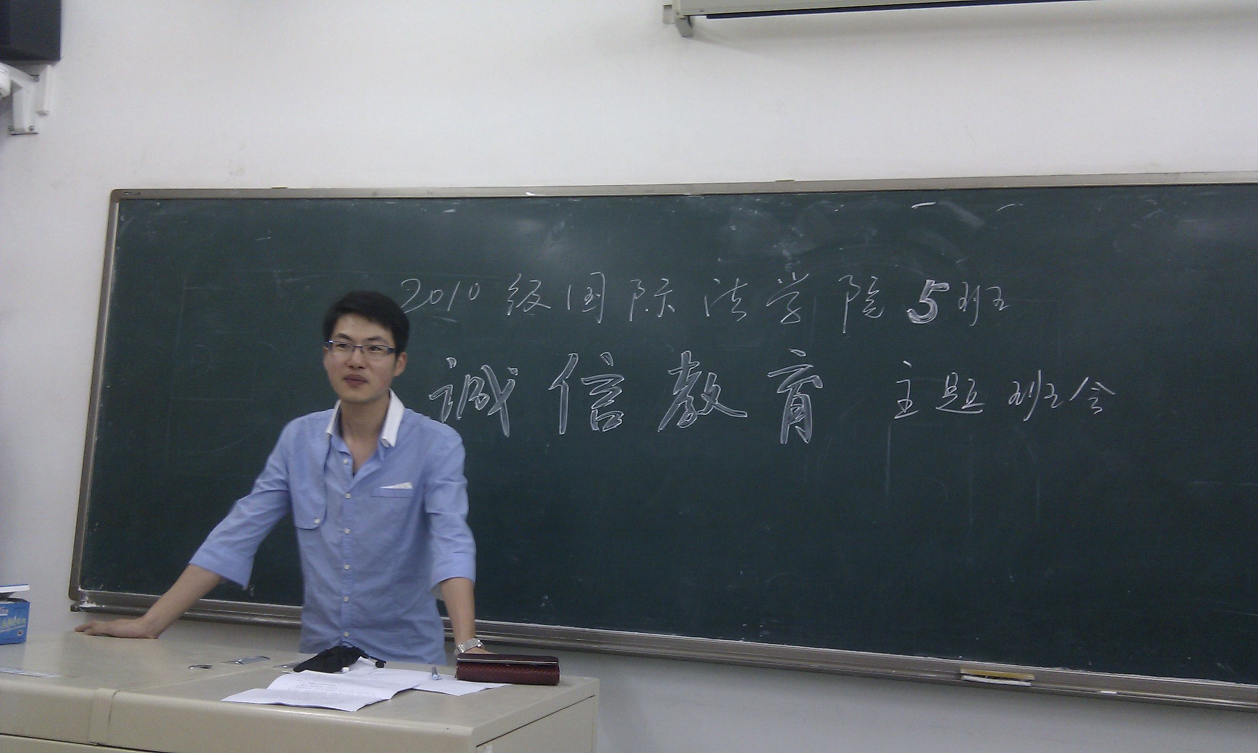同学表现出极大的热情,各班都精心策划,积极准备,态度非常认真。在主题班会中,有的班级采用放视频、讲诚信方面的典型事例,有的班级采取代表发言,小组讨论等形式,对班级同学进行了一次深入的诚信教育。通过主题班会的教育,使广大同学进一步明确了诚信对于一个人成长具有的重要性,认识到诚信是每一个大学生应具备的最基本的道德品质;而不诚信必然会给个人、集体乃至国家带来的严重危害。大家一致表示:作为全国最高法律学府的莘莘学子,我们必须要诚信做人,诚信考试,营造良好的学风与考风,相信同学们真正会谨记 “我诚实,我守信”的坚定信念。