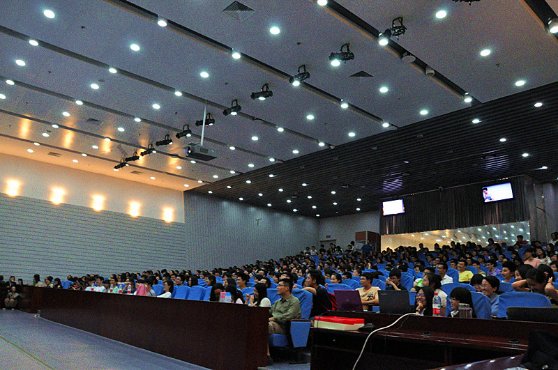 晚上七点,黄西准时来到学术报告厅。他一上台就幽默地调侃自己,一口东北口音更是拉近了与台下同学的距离。黄西从中美文化差异、朋友、节日、教育、家庭、运动等生活的许多方面带来了许多笑料十足的幽默段子,让同学们在捧腹大笑中收获欢乐,忘记烦恼。