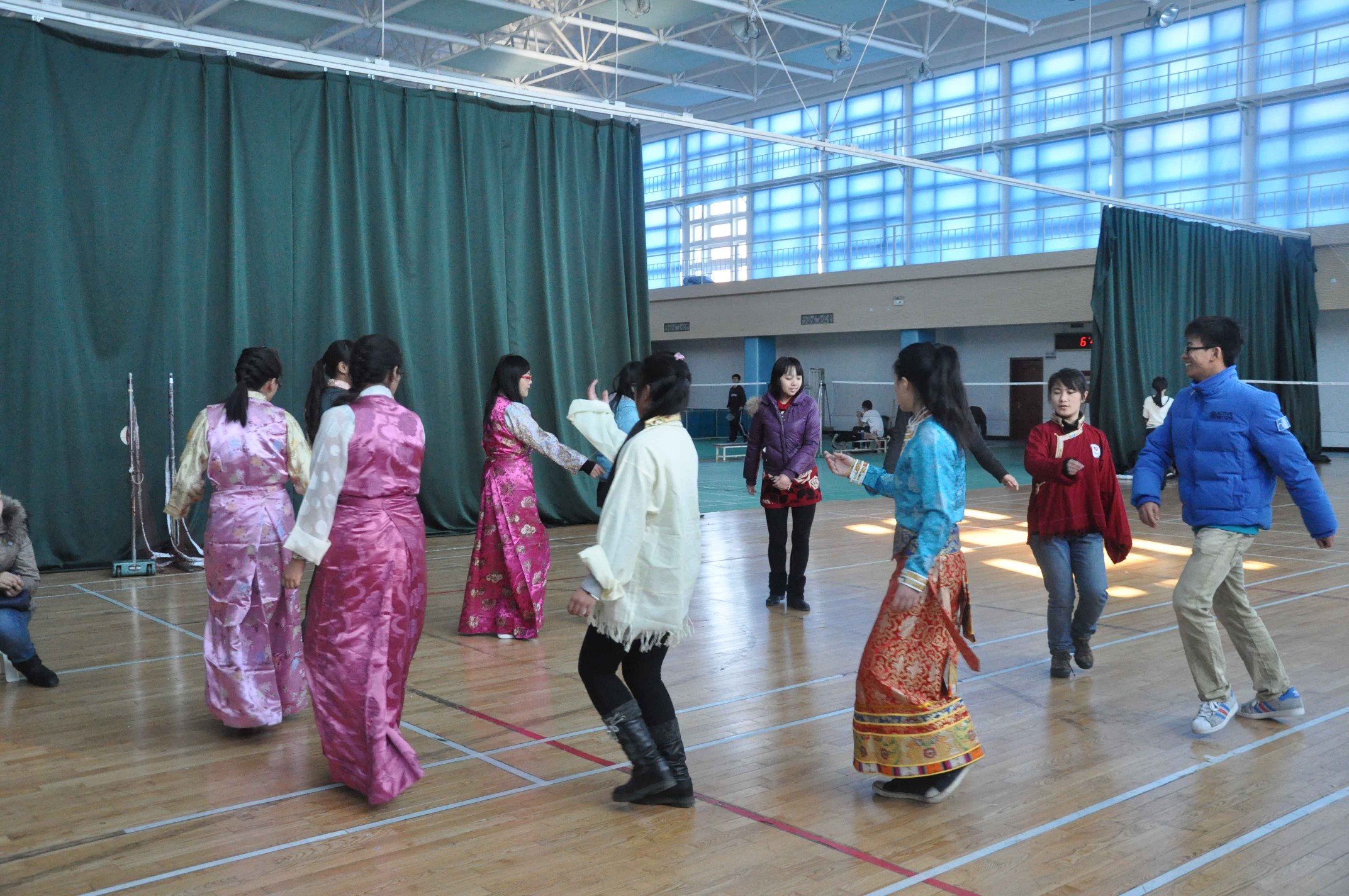 起先一系列的歌舞表演吸引了众人的目光。首先上场的是藏族同胞,她们带来的是藏族弦子锅庄舞。一群身着传统藏袍的姑娘们围成一个圈跳着,那被动感铿锵的乐曲感染了的场下同学也陆陆续续的参与其中。