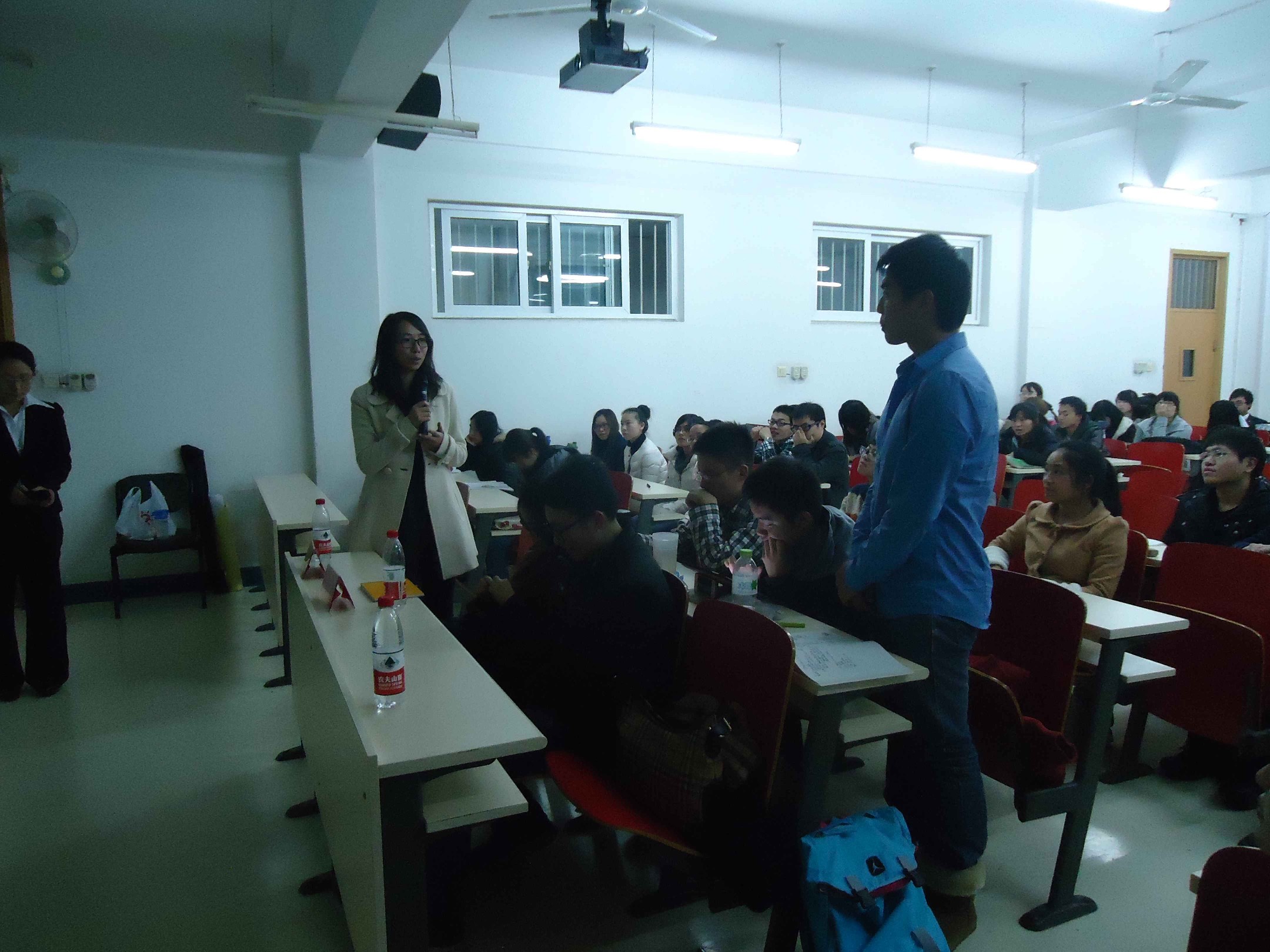 最受学生欢迎的老师之一的杨帆老师,交流会的嘉宾还有09级的优秀学生周菁、周娅睿和蔡元培。