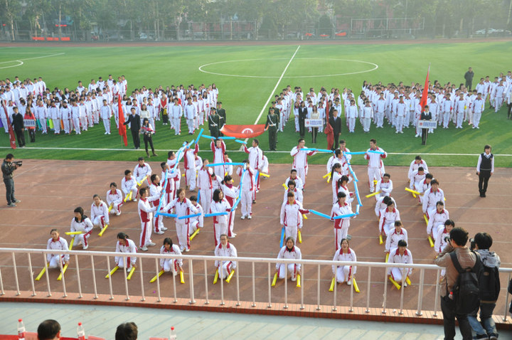 早上7点,参加开幕式方队表演的众多学生就已经赶到操场,为即将到来的开幕式做准备。8点,在师生的翘首企盼中,开幕式正式开始。首先进行的是方队表演,人文学院打响了方队表演的第一枪,为大家带来了一段活力四射的热舞。接着是马克思主义学院,他们把方队表演与最近流行的江南style结合在一起。给现场带来了阵阵欢笑。民商经济法学院的方队利用红黄两种颜色的扇子,为观众带来了视觉上的冲击。