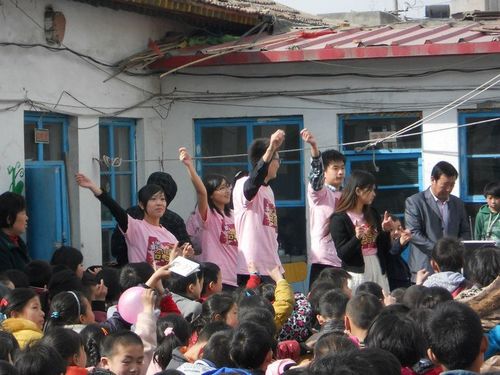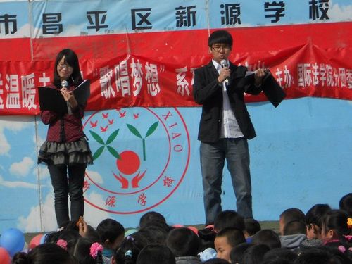 学生会合唱团十八名部员一起前往农民工子弟学校——北京市昌平新源小学进行公益演出。经过从上午九点半到中午十一点的路途奔波,他们终于到达了目的地。中午稍作休息后,下午两点演出正式开始。全校五百名同学以及老师、校长都纷纷搬上小凳子聚集在那一块不大的空地上,很多学生的家长、附近的居民也都过来观看节目,所有人都在满心期待着这一场充满爱心而精彩的节目。