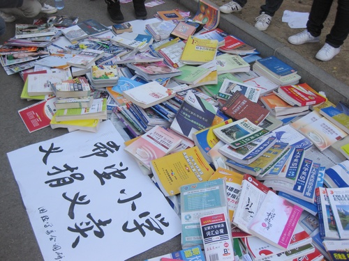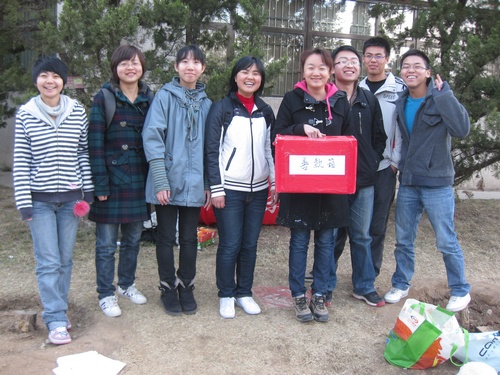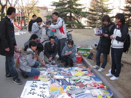 2011年3月25日,一个普普通通的日子,迎着灿烂的朝阳,仰望着湛蓝的晴空,便让人感觉充满了希望和力量。风儿裹挟着寒冷吹在匆匆走过的同学身上,也吹在一群在法渊阁后面的道路上忙碌的同学身上,只见他们小心地从一个个看上去很重的箱子中陆续拿出一些书,文具,光盘,还有衣服,然后有规律的摆放整齐,诧异的目光匆匆掠过……
