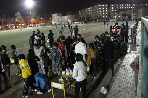 在运动场自然的光亮下,同学们响应地球熄灯一小时的环保号召,纷纷到运动场来参与这一个具有深刻意义的活动。暗夜派对为大家提供了各种美食、饮料,开展了趣味问答、乒乓球、踩气球等有趣的活动。而且,活动主办方还请来新生演唱秀冠军以及合唱团的团员们前来献唱。同学们还纷纷在星愿墙上为自己、家人朋友以及我们共同生活的地球家园留下美好的祝福,并且参与此次活动的同学都得到了精美的小礼品。