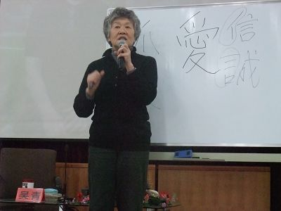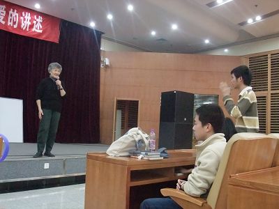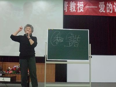 讲座一开始,吴青教授就在黑板上写了一个繁体的爱字,她分析说:“繁体的爱里有一个心字,这说明无心就不是真的在爱,心字下面原来是一个手字,就是说我们大家要手拉手,用心去拉,才是真爱!”“做人是最重要的,尤其是做一个诚实的人,被人信任的人,这样才可能被人所爱”。
