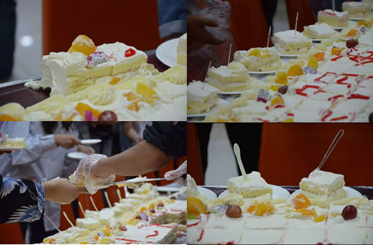 在表演结束后,我们的工作人员为同学们切蛋糕并分发,同学们排队领取,现场井然有序。