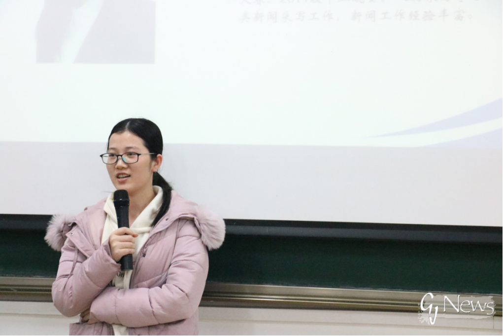 新锐记者代表黄海燕讲述了自己在刚刚接触新闻宣传工作时的一次经历,表示虽为了不让师兄师姐失望,也为了给自己一个交代,必须有严谨认真的工作态度。她认为,新闻宣传工作者要做到以下几点:准备充足、积极主动、分工合作、反应敏捷。最后,她感谢了学院师生对新闻工作的支持和认可。