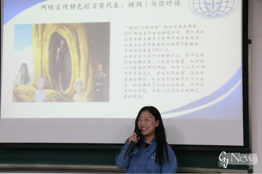 网络宣传特色栏目代表、“树洞|与你对话”的运营者田宇菲简要介绍了树洞的内容和定位,感谢张倩倩老师对栏目倾注的心血,表示愿树洞能成为全体17级同学心中的美好回忆,让这些经验和记忆能永远传递下去。