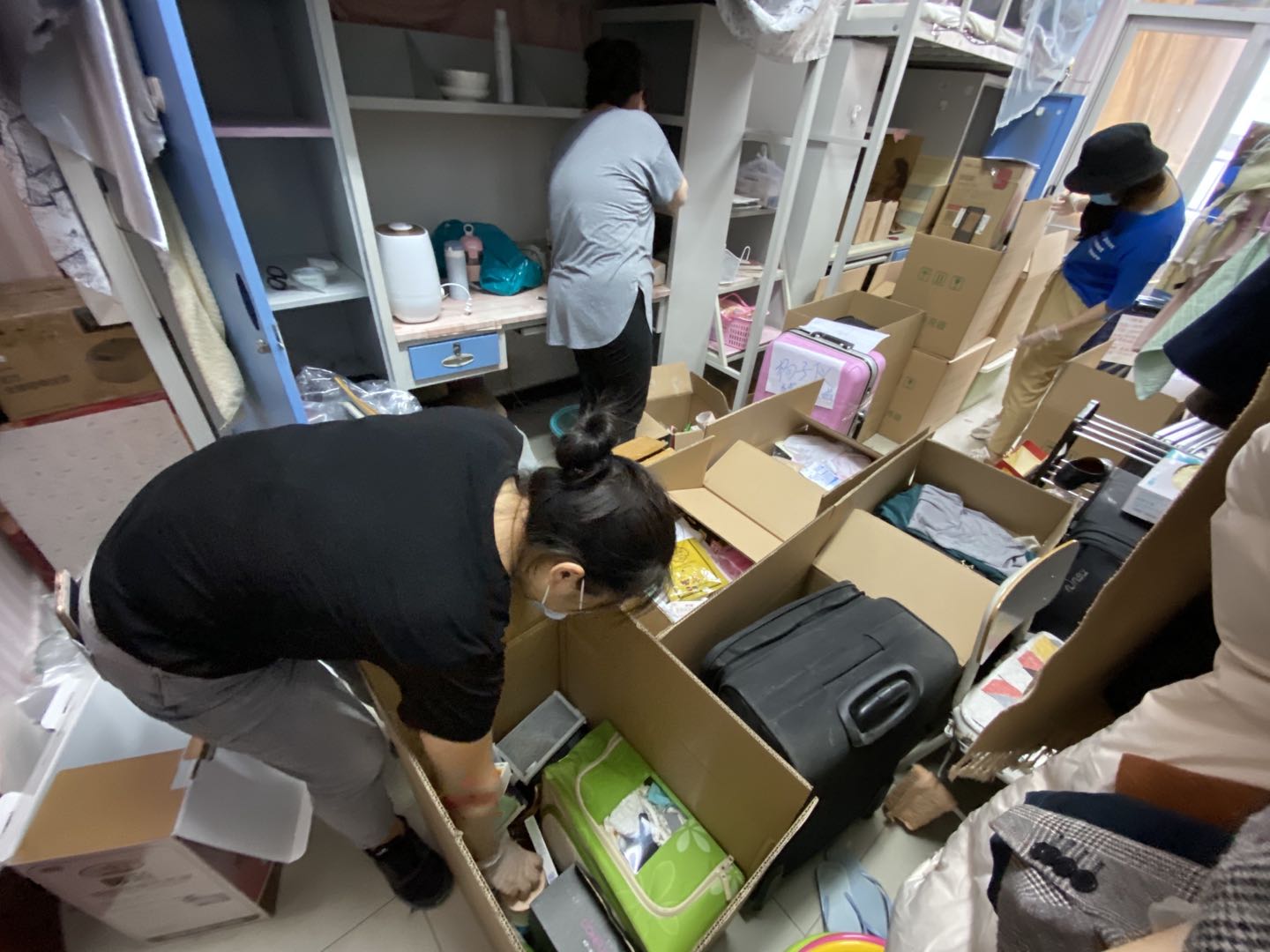 7月11日、12日,学院集中进行行李打包工作。打包过程中,本着“服务学生”的精神,老师和学生志愿者“一对一”、“点对点”与毕业生视频通话,事无巨细,尽心尽力帮毕业生收拾所有物品,完成叠衣物、理床铺、打包裹、清杂物、填清单、贴标语、搬箱子、寄行李“一条龙“服务,两天共计整理近100名学生100余件行李物品。