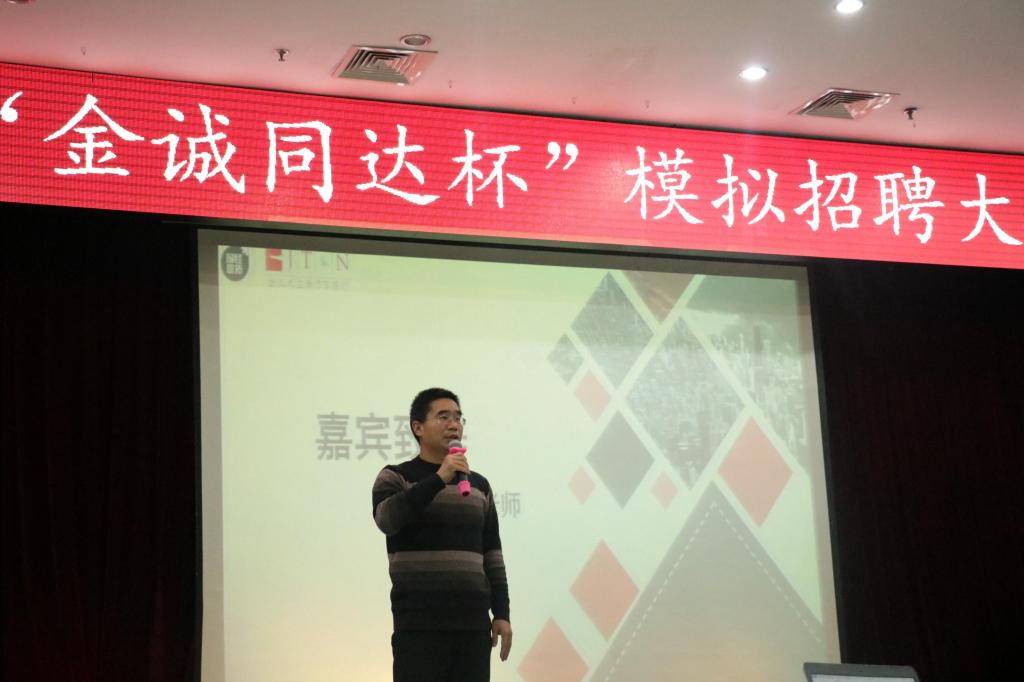 比赛开场,刘凯老师致辞。他提到,面对当今社会大学生就业的严峻形势和人才市场经济的激烈竞争,举办“金诚同达杯”模拟招聘大赛对同学们规范简历制作、汲取面试技巧、交流实习经验有重要的指导意义。“金诚同达杯” 模拟招聘大赛历经八届,通过活动的举办提高了法大在校大学生的应聘和就业技巧,增强了学生的心理素质,提高学生应聘能力和社会竞争力,更为企业与学校、学生建立了更广泛的交流平台。他对各位嘉宾的到来致以诚挚欢迎和感谢,预祝比赛圆满成功。