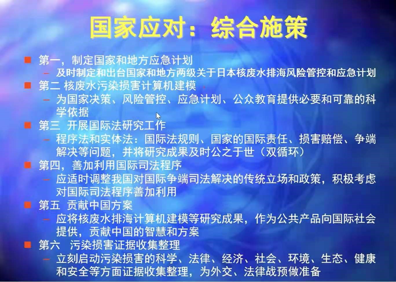 针对日本核污水排海决定,高之国教授从“综合施策”与“法律路径”等方面提出了具体的应对建议和措施:第一,制订国家和地方应急计划。第二,进行核污水污染损害计算机建模。第三,开展国际法研究工作。第四,善加利用国际司法程序,适时调整我国对国际争端司法解决的传统立场和政策。第五,贡献中国方案,将核污水排海的计算机建模和国际法研究等成果,作为公共产品向周边国家、国际社会和相关国际组织提供。第六,证据收集整理,立刻启动污染损害的科学、法律、经济、社会、环境、生态等方面证据,为外交与法律战做准备。