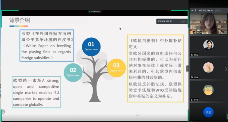 随后,何仁平同学做出长达约一个小时的报告。她展示了精心制作的ppt演示文稿。何仁平同学表示,其研究展开的背景为欧盟委员会发布《在外国补贴方面创造公平竞争环境的白皮书》试图用竞争法的思路替代贸易救济法来规制补贴。《白皮书》声称其出发点为维护欧盟统一市场的公平竞争环境,主要针对如何应对外国补贴在欧盟统一市场内对竞争产生影响的问题提出建议,这些建议涉及外国补贴导致的“市场扭曲”、外国补贴对欧盟企业收购的影响以及政府采购中的外国补贴等问题。但值得指出的是,《白皮书》功能定位本身的合理性值得质疑和商榷,其可能产生的实际影响与其所追求的价值目标不符,以及可能存在对市场扭曲的定义不清、标准不明且认定权缺乏约束等问题,对贸易救济法和竞争法的杂糅最终可能导致欧盟内部贸易保护的结果。何仁平同学的报告就以上问题进行详尽的分析,进而对《白皮书》厘清贸易救济法和竞争法的界限提出建议。
