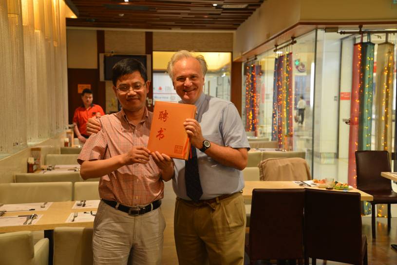 在宴会上,还举行了客座教授受聘仪式,鉴于Joel W. Friedman教授的学术成就和为我校做出的贡献,特聘其为我校客座教授,由孔庆江院长代表我校向Joel W. Friedman教授颁发了聘书。