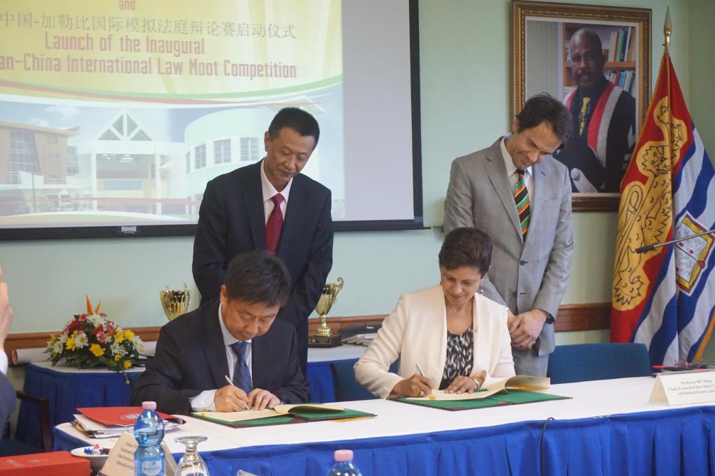 西印度大学是由加勒比海地区16个使用英语的国家共同支持组建的自治性区域大学,分别在牙买加、特立尼达和多巴哥、巴巴多斯设有三个主校区及一个开放校区。以孔子学院为平台,我校与西印度大学的合作不断向纵深发展,多领域开花结果。两校将共建中国—加勒比法律研究中心、开展中国—加勒比文化互译出版合作、共同举办模拟法庭竞赛。借此次访问之机,两校正式磋商达成一致,在当地多家主流媒体的见证下,胡明与西印度大学凯夫希尔分校校长尤丁·巴丽图(Eudine Barriteau)签署共建法律研究中心协议、与西印度大学开放校区校长鲁兹·朗斯沃(Luz Longsworth)签署出版合作协议,我校出版社社长兼总编辑尹树东、西印度大学出版社总经理约瑟夫·鲍威尔(Joseph Powell)也分别在出版合作协议上签字。当天,还隆重举行了两校首届模拟法庭友谊赛开幕式,西印度大学凯夫希尔分校法学院院长大卫·贝瑞(David Berry)、我校黑料网