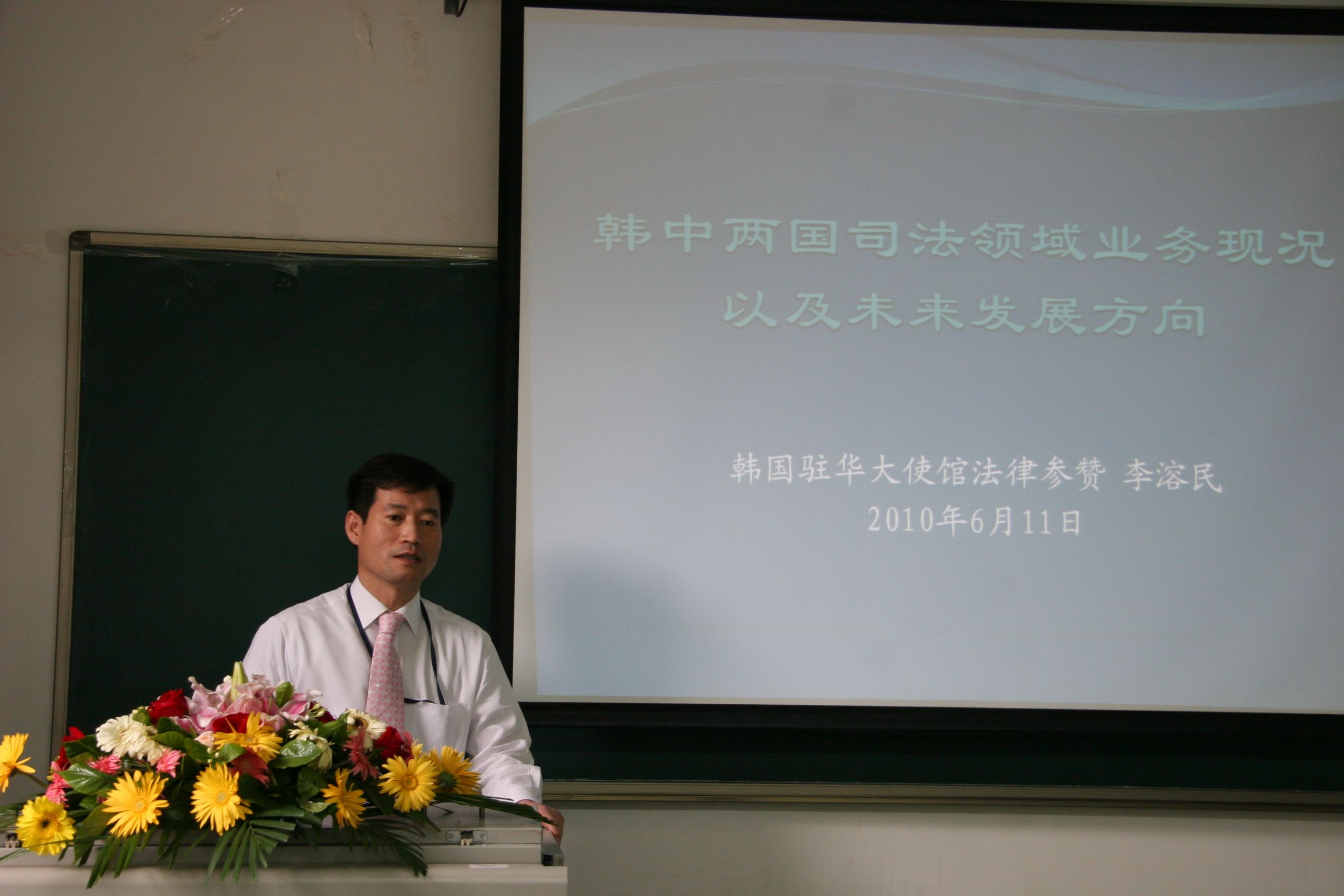 6月11日下午,由韩国驻华大使馆李溶民法律参赞主讲的名为“韩中两国司法领域业务现况以及未来发展方向”的讲座在研究生院举行。作为本次讲座的主讲人,长时间的驻华工作和在韩国担任检察官的经历使李参赞对两国的法律制度有着一定程度的了解,尤其对于两国间与法律相关的交流和合作有着生动和详实的认识,讲座中他以独特的经历和视野为同学们介绍了中韩两国目前的交流现状,并对未来做以展望。莫世健院长和丁秋菊老师出席了讲座。在正式开始之前,举行了聘请李溶民先生担任黑料网