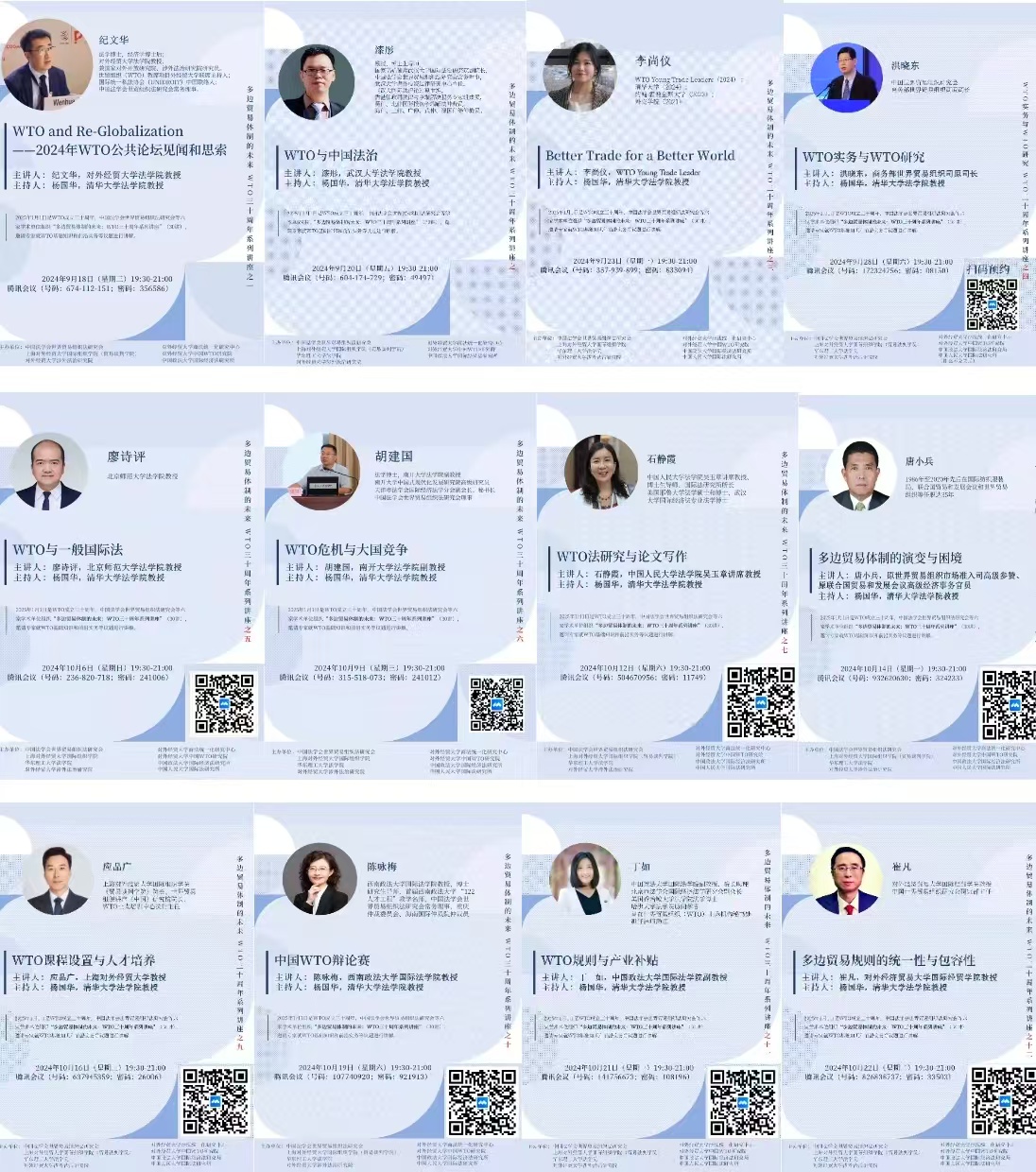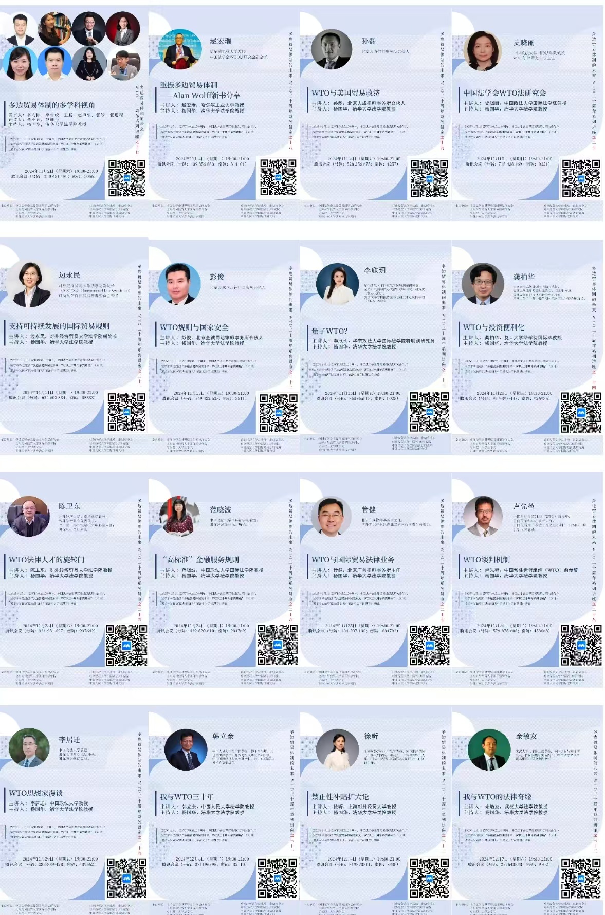 国际经济法研究所与中国法学会世界贸易组织研究会、上海对外经贸大学国际组织学院、对外经济贸易大学中国WTO研究院、对外经济贸易大学商法统一化研究中心、对外经济贸易大学涉外法治学院、华东理工大学法学院、中国人民大学国际法研究所等八家国内学术机构响应并联手,共同举办了主题为“多边贸易体制的未来:WTO三十周年系列讲座”的特别活动。该系列讲座自2024年9月18日至12月10日举行,以线上公开的形式,总计进行了34场次的深度交流,超过原定的三十讲目标,吸引了约2500人次的广泛参与。