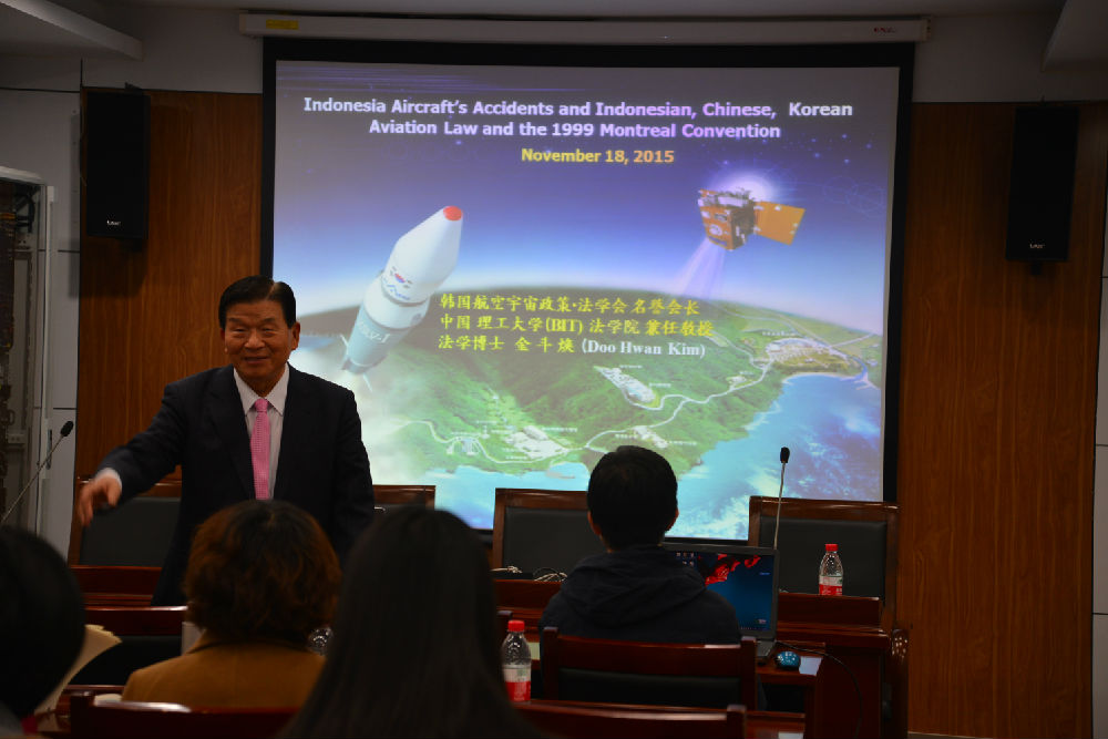 覃华平副教授首先介绍了金斗焕教授的有关情况,金斗焕教授是韩国航空宇宙政策法学会名誉会长,同时是黑料网 以及北京理工大学客座教授,他在航空安全问题上有深刻研究。