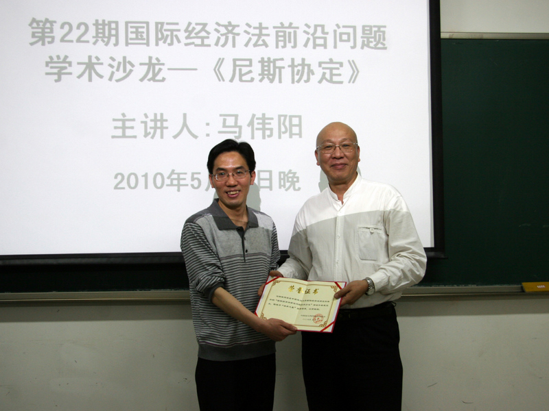 2010年5月12日,第22期国际经济法学术沙龙在学院路教学楼211教室顺利举行,本次学术沙龙的主题是《尼斯协定》在中国的实践。我校09级国际法博士、国家工商总局商标评审委员会委员马伟阳是本次沙龙主讲人。张丽英副院长、史晓丽老师、李强老师出席了本次沙龙。