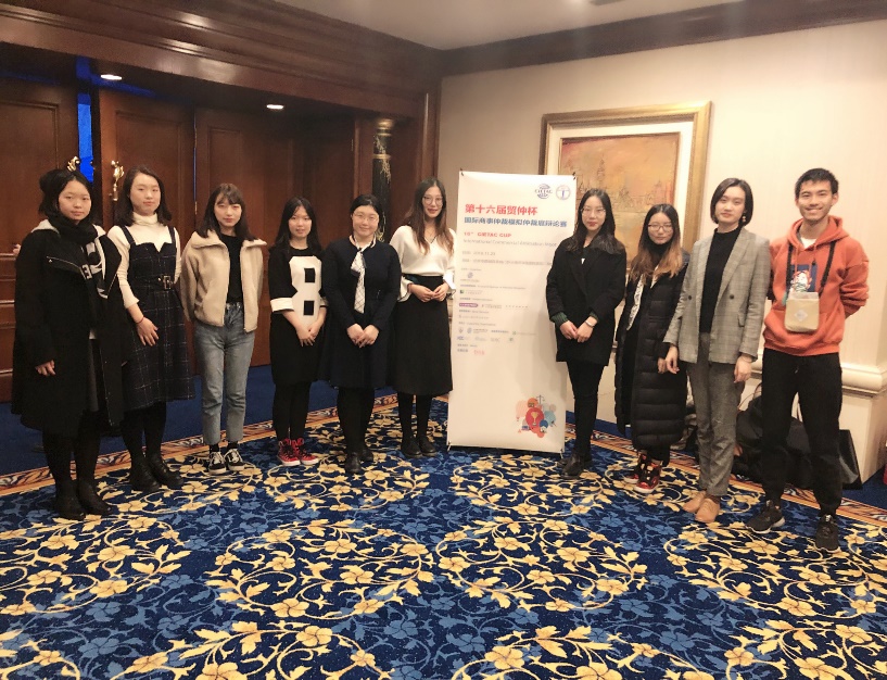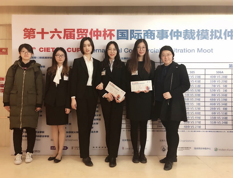 (第十六届“贸仲杯”表彰大会上,我校代表队队员与带队老师合影)