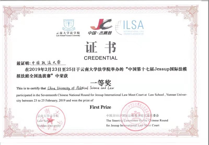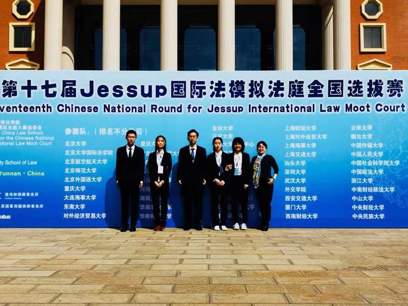 2019年2月23日至25日,第十七届杰赛普(Jessup)国际法模拟法庭大赛中国赛区选拔赛在云南大学举行。本届比赛有52支院校队伍参加。第一阶段是循环赛,我校代表队以良好的法律素养、出色的庭辩水平、互补互助的团队精神和沉着冷静的心理素质突出重围,对阵复旦大学、南京大学中美中心等代表队,4场连胜,以书状和口头总分位列52支队伍第1名的历史最好成绩进入循环赛,刷新了我校的最好成绩。在第二阶段淘汰赛期间,以极微弱的情形,惜未能晋级。